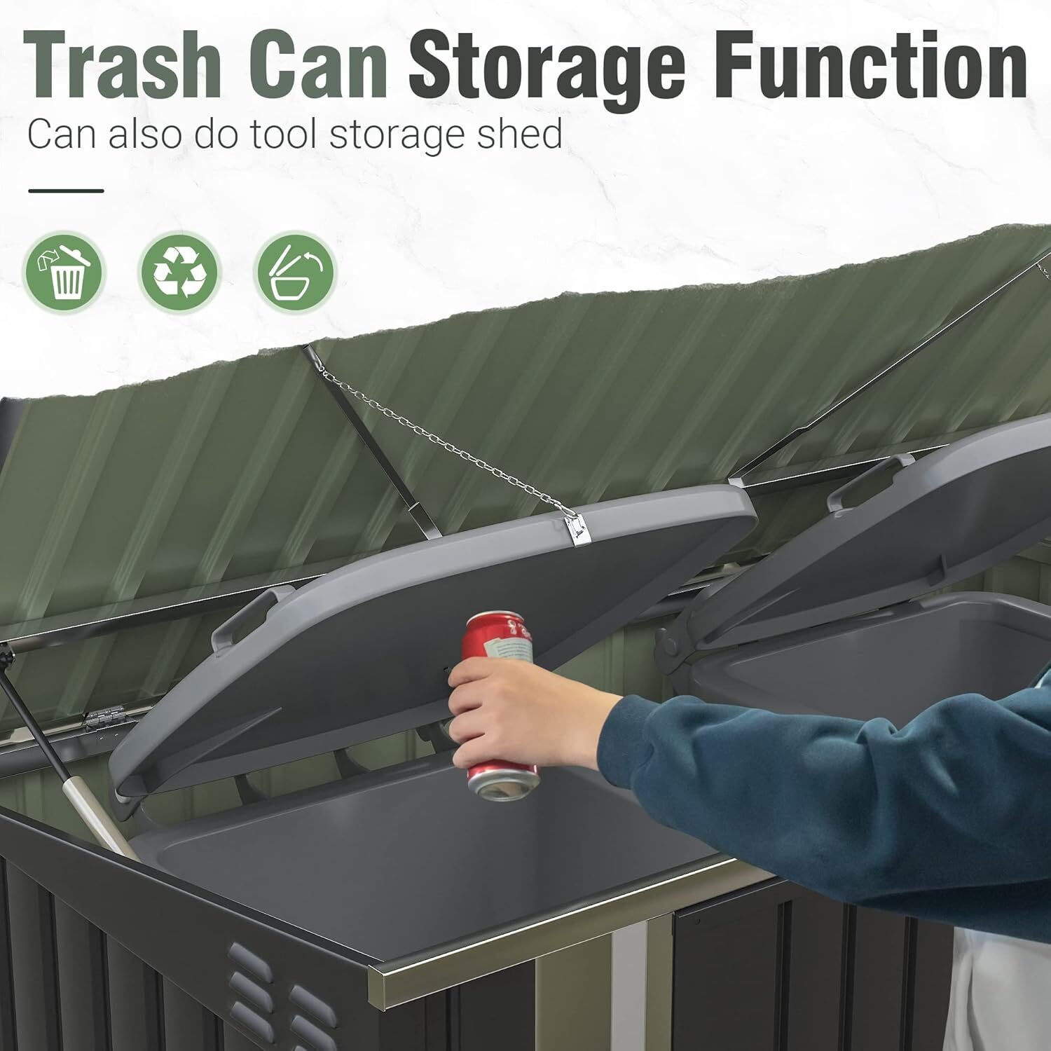 Designed to maximize space efficiency, this versatile storage shed holds two large garbage cans with ease, keeping your backyard or garden tidy. If repurposed as a storage box, it accommodates a variety of garden tools, outdoor toys, and equipment, ensuring organized storage while taking up minimal yard space. Suitable for households or businesses, this shed meets diverse needs without compromising aesthetic appeal.