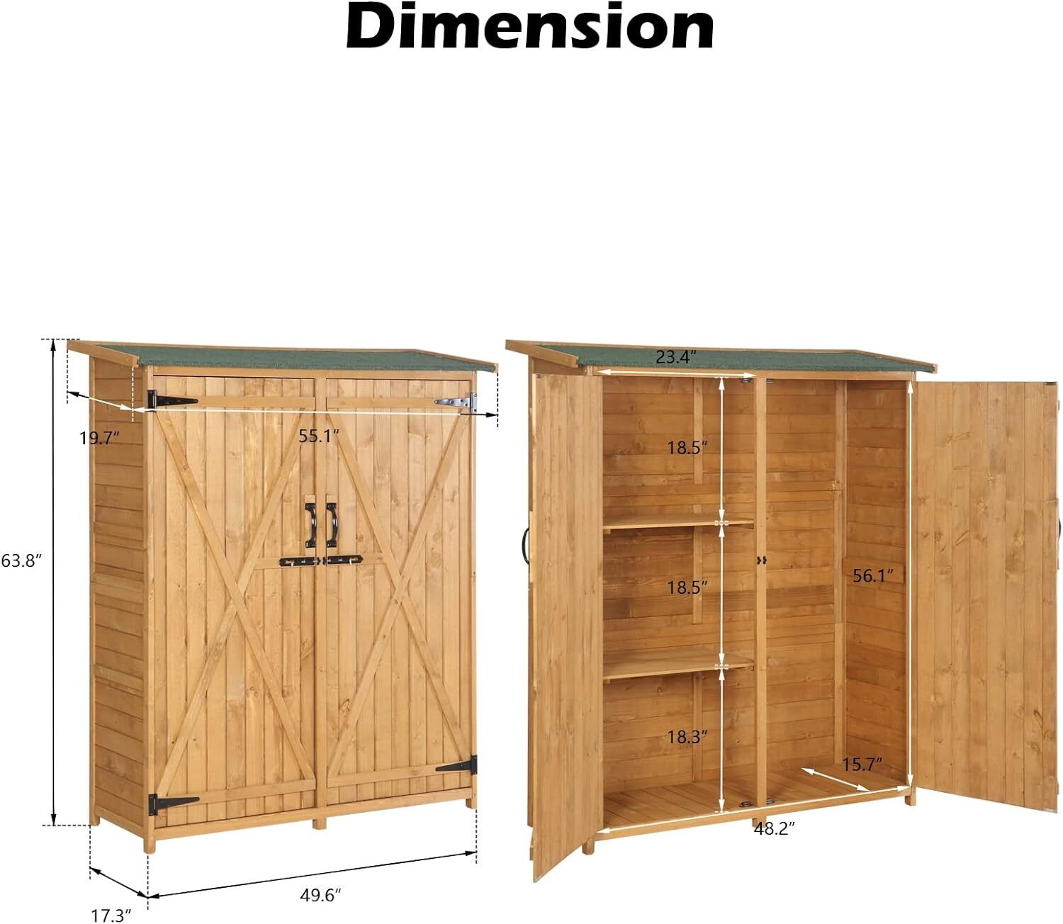 With dimensions of 49.6”L × 17.3”W × 63.8”H, this tall storage cabinet provides generous space for storing garden tools, pool accessories, lawn care equipment, and other household items while maintaining a compact footprint.